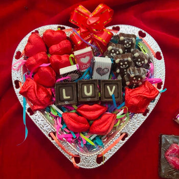 Valentine's day gift combo-3 for couples as it comes in heart shape chocolate gift hamper for love as it comes with chocolate heart, chocolate teddy, chocolate message, chocolate rose, love chocolate and chocolate kisses.